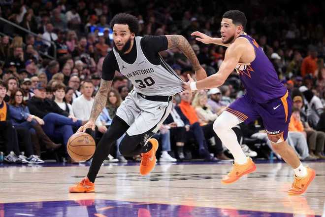 中場休息回來,太陽進攻端火力大幅提升,他們第三節(jié)轟下兩隊本場唯一一次單節(jié)35+得分,且限制馬刺全場首次單節(jié)不超過25分。太陽率先63-62反超比分,馬刺一波8-1攻勢反超6分,太陽在布克與狄龍引領下打出22-10攻勢,太陽單節(jié)37-24凈勝13分,三節(jié)結束太陽86-80反超馬刺6分。前三節(jié)比賽,太陽4人得分上雙,布克21+4+5、狄龍18分、馬威14+9與古德溫10+9,馬刺3人得分上雙,??怂?7分、瓦塞爾15分與凱爾登10+6。